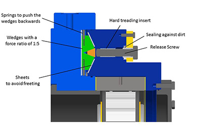 The latest generation of such a mechanical – now patented – release device can be seen in figure 10: Three small packs with wedges are situated in the housing of the BS. These wedges increase the axial force of the screws (power ratio 1:5) and they are also used to release the torque limiter. The device is sealed and the moving parts are equipped with hardened metal surfaces to prevent friction corrosion. The resetting of the wedges – when activating the TL – is carried out by the springs. The release device is operated very easily using a conventional screw wrench. Special tools such as a hydraulic pump are not necessary for the handling of this robust mechanical solution.