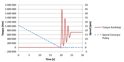 Figure 4: Fast running BS with sprag lift-off in a single drive assembly group: The speed of the conveyor pulley falls back to 0 rpm and after 19 seconds the backstop holds the load with a peak torque of 91,000 Nm.
